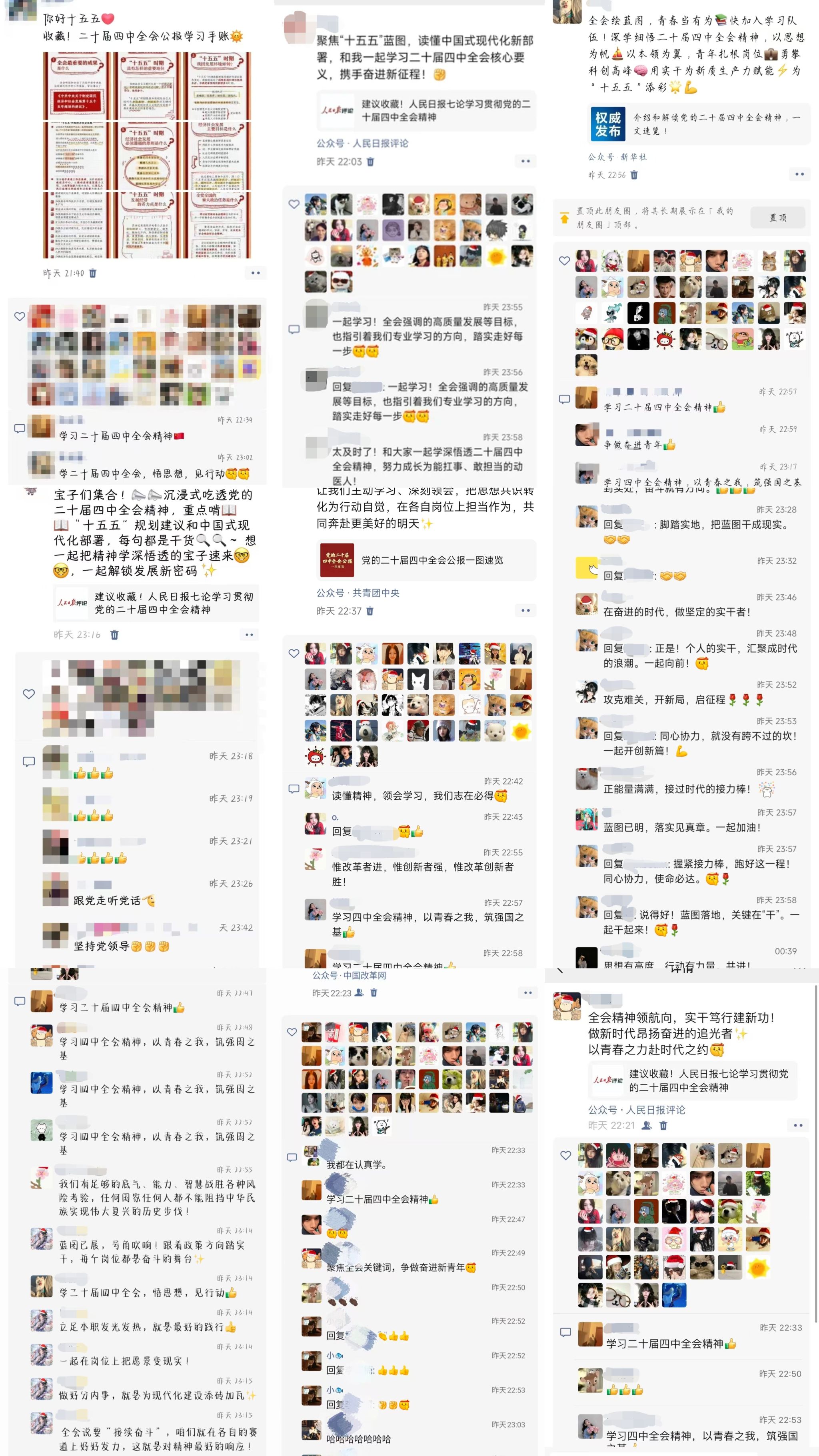 学院遴选优秀学生骨干,以“线上扩散+青年联动”的方式拓展学习半径,学生骨干主动结合自身学习体会,撰写个性化学习感悟,并附带个人学习笔记等素材,发布在朋友圈、QQ空间等青年常用社交平台。这些内容引发了学生间的广泛互动——不少学生在评论区交流学习心得,推动全会精神在青年社交圈层中“活起来、传开来”。