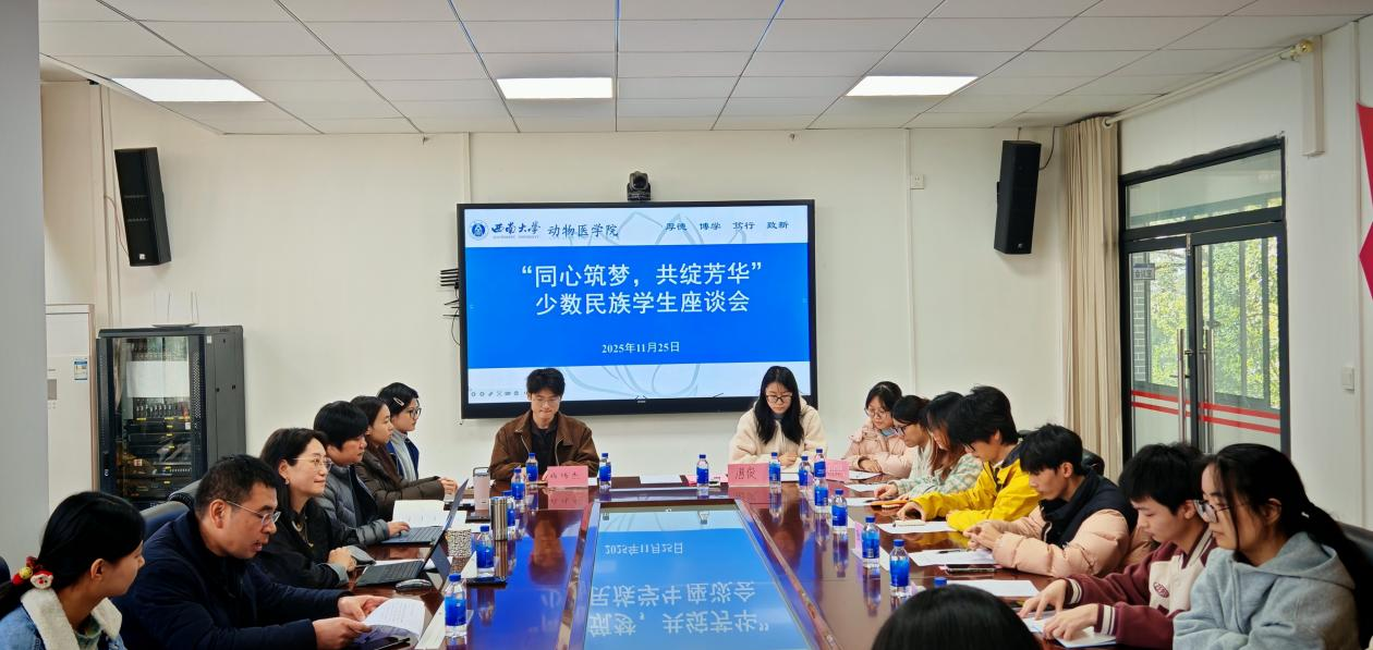 为促进民族团结,倾听学子心声,11月25日下午,动物医学院“同心筑梦,共绽芳华”少数民族学生座谈会在学院会议室温馨举行。学院党委书记李海燕,党委副书记、纪委书记罗丹,副院长宋振辉,团委书记兼学工办主任刘晓兰,各年级辅导员与19名2027级少数民族学生代表齐聚一堂,畅谈心声,共话未来。座谈会由副院长宋振辉主持。