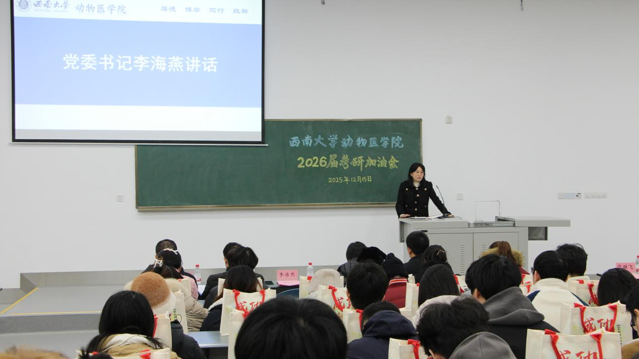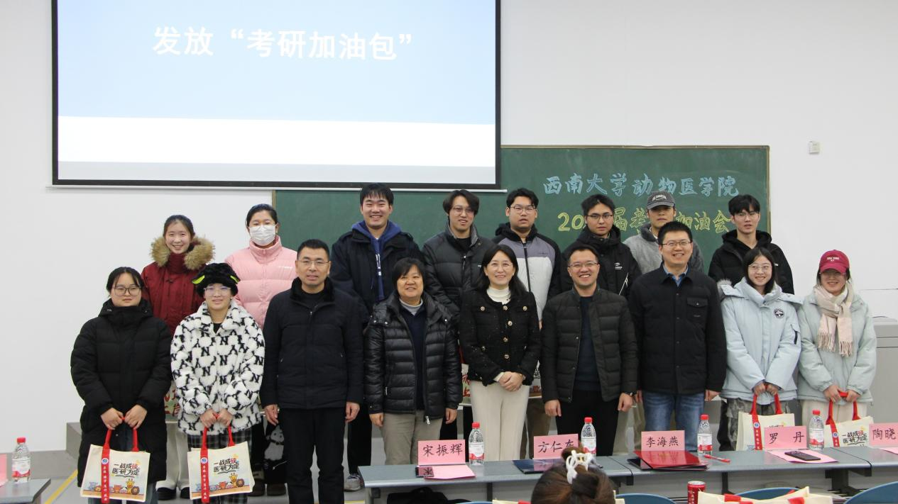 12月15日上午,动物医学院在荣昌校区2111教室为2026届考研学子举办了一场温馨而鼓舞人心的考研加油会。学院党政领导、团委书记、毕业班班主任及辅导员共同出席,与160余名备战考研的学生齐聚一堂,为他们送上关怀与鼓励。
