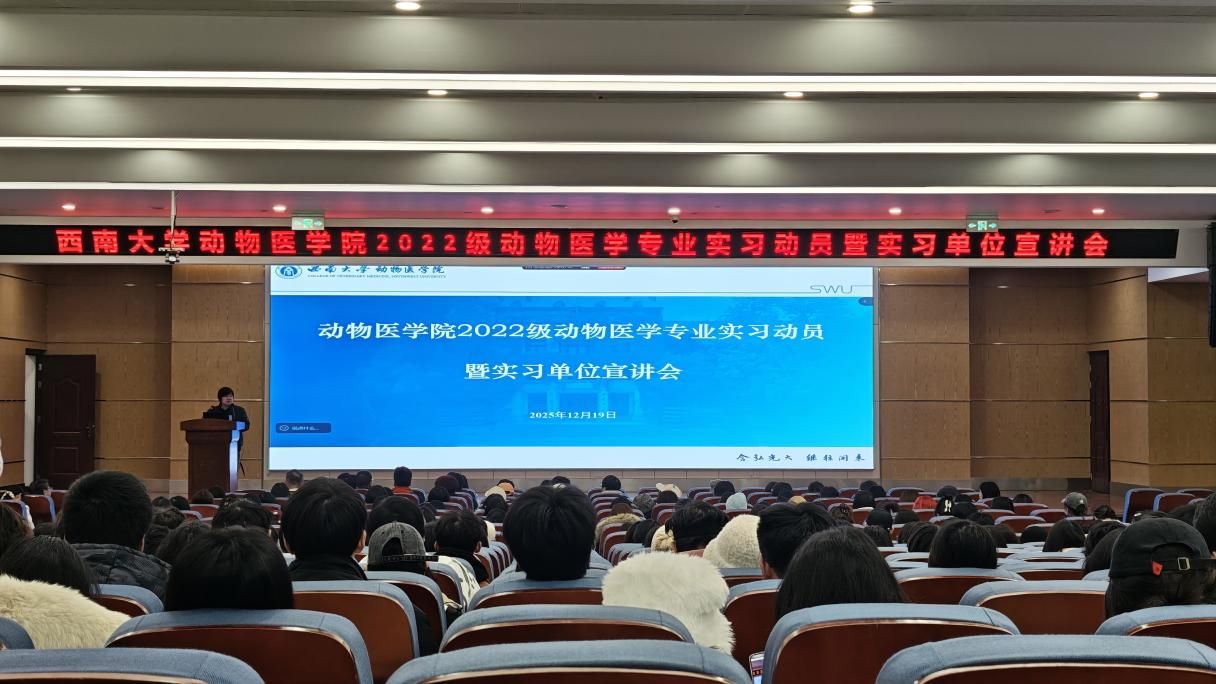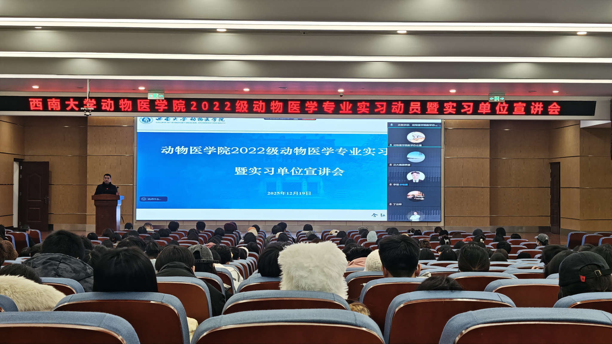为扎实推进动物医学专业实践教学工作,强化学生专业实践能力与职业素养,引导学生明确实习目标、做好实习准备,搭建校企对接桥梁,学院于12月19日下午在7B201会议室隆重召开2022级动物医学专业实习动员暨实习单位宣讲会。动物医学院党委副书记、纪委书记罗丹,学院团委书记、学生工作办公室主任刘晓兰,各系负责人、班主任、辅导员及2022级全体动医专业学生参会,学院副院长宋振辉主持会议。