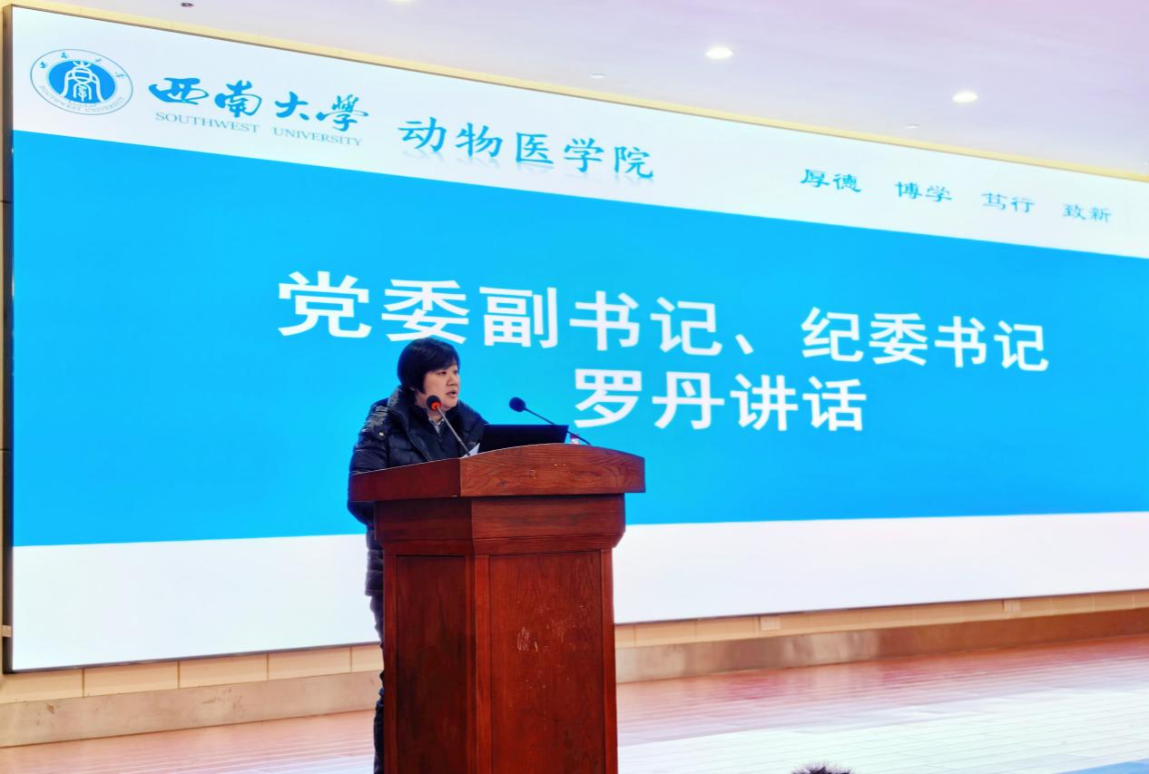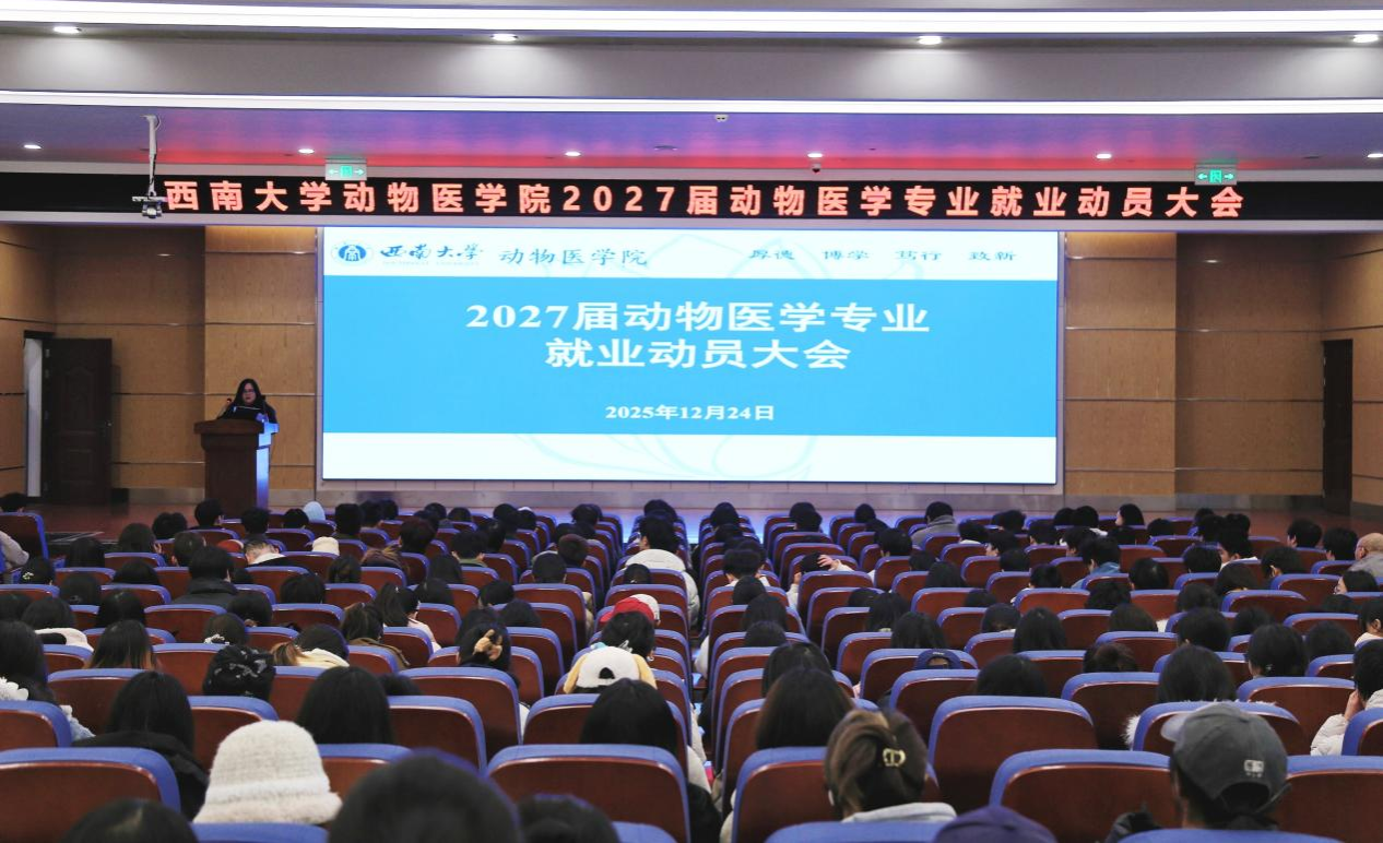 2025年12月24日下午,西南大学动物医学院于荣昌校区7B201报告厅召开2027届动物医学专业就业动员大会,正式拉开新一届毕业生就业工作序幕。学院党委副书记、纪委书记罗丹,团委书记、学生工作办公室主任刘晓兰,毕业班辅导员吴婷芳、张龙祥等班主任等及全体286名本科生出席会议。大会旨在明晰就业形势,启动学院贯穿全学年的精准就业支持计划。