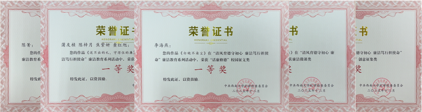活动期间,学院共征集到作品42篇,经遴选向学校推荐优秀作品18篇。其中,李海燕同志的作品荣获校园征文类一等奖;陈箐同志的作品荣获创意征集类一等奖;蒲友桢、陈梓月、焦紫妍、查红旭同志的作品荣获廉洁微课类一等奖;吴秋云同志的作品荣获廉洁微课类二等奖。与此同时,共有14名师生的7项作品荣获三等奖,涵盖校园征文类、创意征集类、视频征集类及廉洁微课类等多个类别,充分展现了学院师生崇廉尚洁的精神风貌与扎实的创作能力。