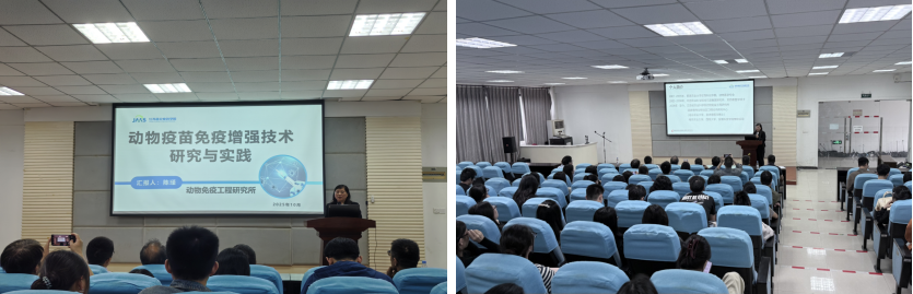 陈瑾以《动物疫苗免疫增强技术研究与实践》为题,聚焦“佐剂递送系统+免疫增强剂”双轮驱动,剖析兽医疫苗佐剂面临的共性难题:产品稳定性差、耐热性弱、免疫副反应高和临床保护率低等。她指出“让每一支疫苗都能跑完‘最后一公里’,是我们兽医科技工作者的时代使命”,并勉励同学们以“临床问题”选题,解决兽医临床中的痛点问题。